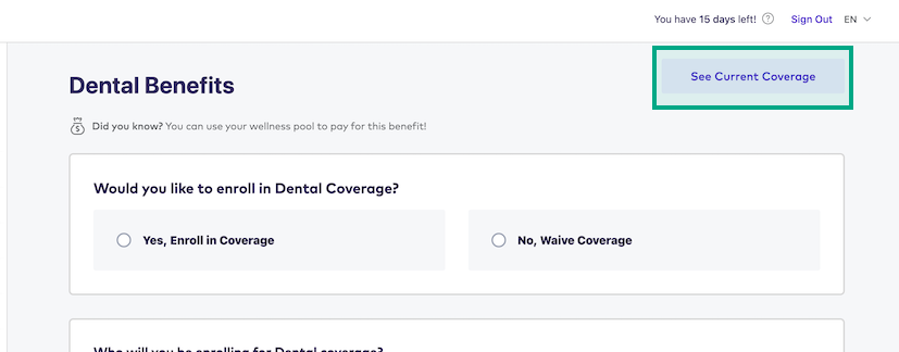 Click “See Current Coverage” at any point in the enrollment experience to compare your current and new benefit selections.