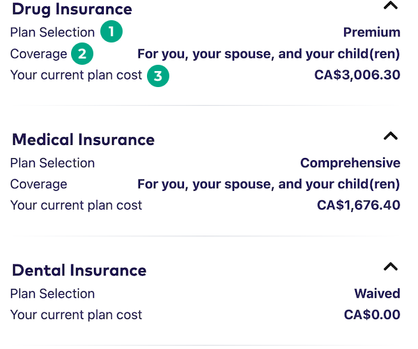 Plan selection: The plan level you’re currently enrolled in. If you didn’t enroll in a benefit, this will say “Waived”.
