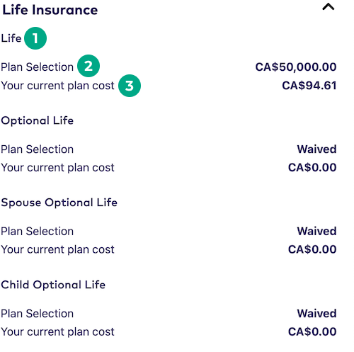 Plan selection: The amount of coverage you currently have for each type of insurance. If you didn’t enroll in this benefit, this will say “Waived”.
