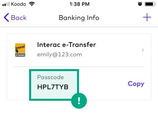 4. On this page, you'll see the recipient email and e-Transfer passcode.
