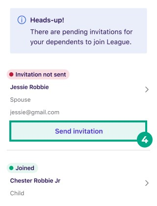 4. You’ll see a banner reminding you to invite your dependents to join League. Tap “Send invitation” for any dependent with an “Invitation not sent” status.